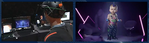 モーションキャプチャで動き回るCG映像は、モヒカン刈りの赤ちゃん。可愛らしい赤ちゃんが大人顔負けの真面目なセリフを吐くので、会場一同大笑いに包まれた。モーションキャプチャスーツ、フェイシャルキャプチャなど個々の市販ツールは珍しくないものだが、Kite&Lightning社の今回のデモは、それらを連携させて、ライブ映像つまりはリアルタイムで映像化したものだ。また大規模なスタジオを必要とせず、スーツとリグさえ装着すれば誰でも一人で収録可能なことも評価が高い。