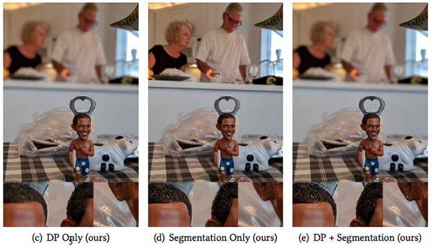 スタンフォード大学の研究。ポートレート写真撮影の際、人物そのものはよく撮れた写真の背景が気に入らない時の調整手法。自動マスク生成でのいわゆるポートレート写真化する手法。最新のiPhoneのように2つのカメラ素子を搭載したスマートフォンであれば、背景がボケるポートレート撮影モードをもったものもあるが、本研究はカメラ素子が1つしか無い場合でも人物像のマスクを切り取り、人物と背景を分離し、背景部分のみ、被写界深度を調整した適切なボケ具合でポートレート写真にする技術。複数の人が写っている写真や、人物ではなくオブジェクトに対しても実行できるよう工夫されている。