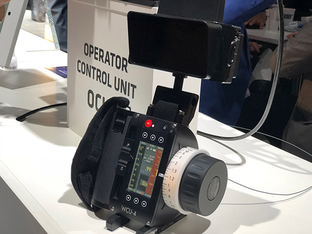 通常、フォーカスコントロールはWCU-4デジタルリモートホイールで制御するが、今回新製品としてOCU-1が展示されていた。OCU-1はフォーカスマンがフォーカスコントロールをリモートでコントロールしている場合、これまではオペレーター自らフォーカスを変えることができなかったが、このOCU-1を使用することで、フォーカスコントローラー間に介在できるようになり、オペレーター自らフォーカスをコントロールする事ができるようになった。