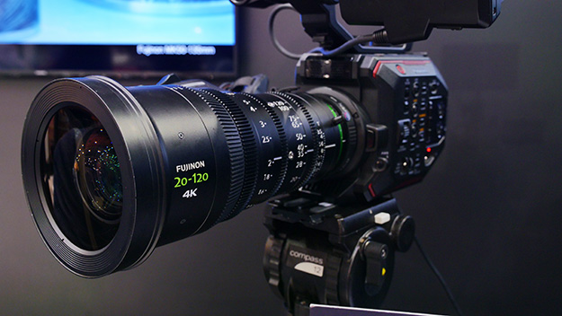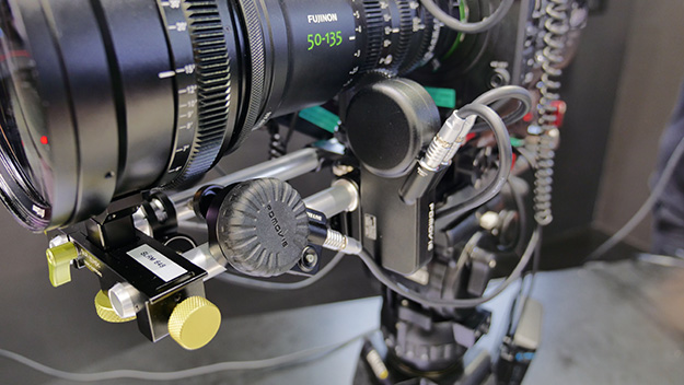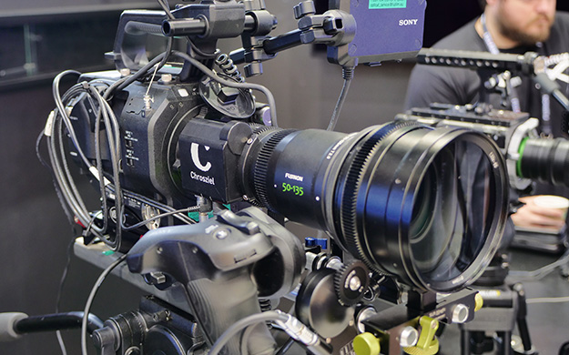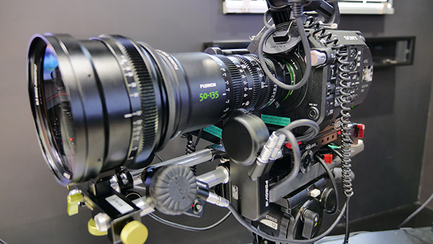 富士フイルムブースでは、Sony FS7にMK50-135mm T2.9シネレンズを組み合わせ、SLR Magic社製1.33x-65Anamorphot Adapterのアナモフィックレンズアダプター、PDMOVIE社製リモートフォーカスシステム、Chrosziel社製ズームサーボという組み合わせのカメラシステムの参考出品が目を引いた。