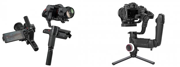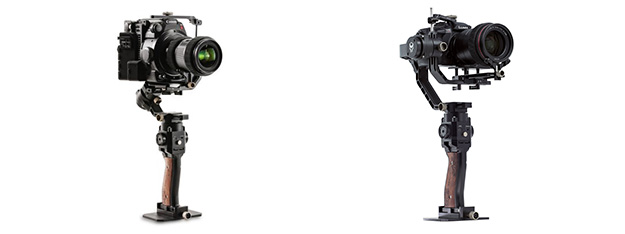 CRANE 3 LABは撮影時の安定性を高める両手グリップデザインを採用。付属の三脚をスタビライザーにマウントしてハンドグリップとして使用することにより垂直に保持したり、ローアングルポジションにできる。また、スタビライザー本体の3軸モーターにロック機能を備え、バランス調整が正確に取れていれば、再び同じカメラとレンズを乗せる場合はバランスの再調整が不要。すばやく撮影を再開できる。4.5kgの最大搭載荷重に対応する。