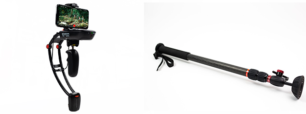 左からiPhoneとAndroid向けのスタビライザー「Steadicam Volt」と一脚の「Steadicam AIR」