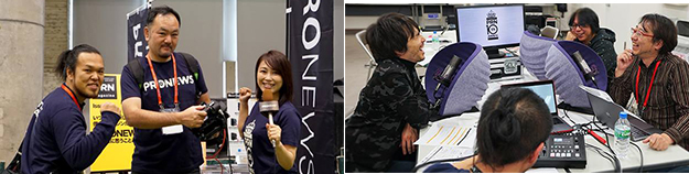左からINTER BEE CREATIVE MEET-UP内のPRONEWSブースとPRONEWS RADIO収録の様子