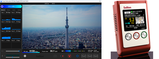 「Smart-Telecaster HDView」と「HDView Single」を展示。複数のモバイル回線を利用して、安定した高画質映像をライブ中継する製品。送信機から受信した映像はベースバンドで出力しつつ、同時にNDIでも出力されTriCasterシリーズとシームレスに連携する。