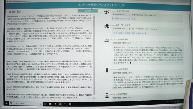 NEC Cloud Solutionsの映像プラットホームサービスにはいくつかあるがその中の一つにAIなどの先端技術の実装があり、これらには映像解析、音声解析、文章解析などがある。具体的にはアナウンサーなどが読み上げる文章やインタビューなどを自動的にテキスト化し、更に要約文章を自動生成する。要約文章の文字数なども指定することが可能