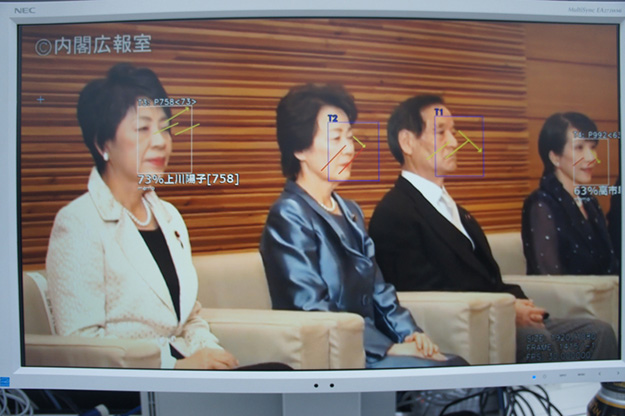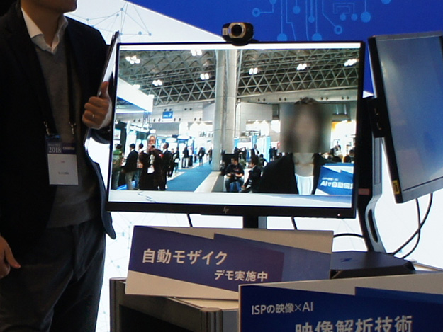 ISPシステム計画研究所/ISPでは「ISPの映像×AI」をテーマに、異常検知、リアルタイムプライバシー保護、骨格推定、テロップ解析など、AIを応用した映像解析技術を幅広く紹介。ブースでは顔認証を利用して自動的にモザイク処理を行うデモを行っていた