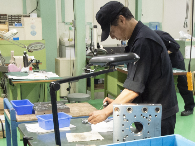 金型とはプレス加工、プラスチック成形などに用いられる金属製の型のことで、プラスチック部品であれば樹脂を流し込んで成形する。シグマでは金型の設計、製造、メンテナンスもすべて自社で行うことで、細かな調整やトラブルがあってもすぐに対応できる体制を敷いている。