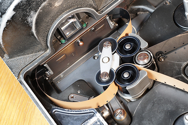 16mm100フィートスプール巻き。スプールに巻いてあるフィルムは明るいところで作業できます。ただし、直射日光下で取り扱うことはありません