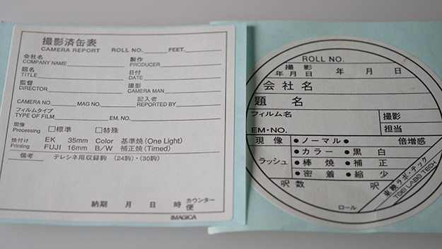 缶表。左はイマジカ、右は東映ラボ・テック(現在、東映ラボではフィルム現像はできません)