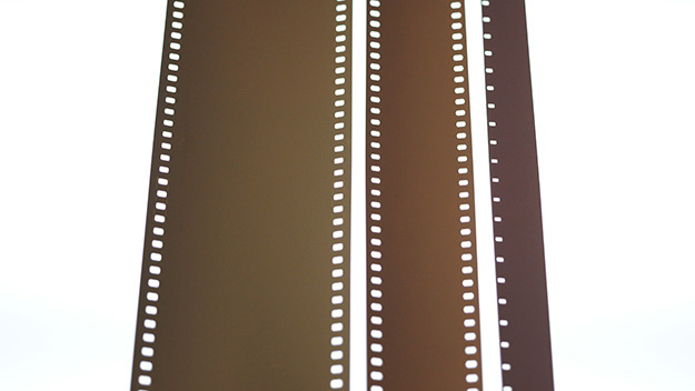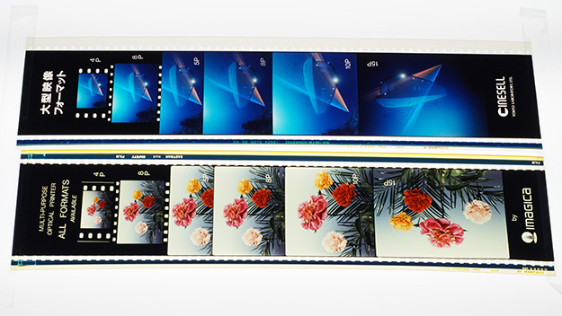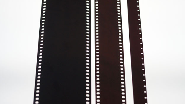 左から65mm、35mm、16mm。こちらは裏面。黒い色は、潤滑剤と裏からのハレーションを防止するバックコート。この面は何も写りません
