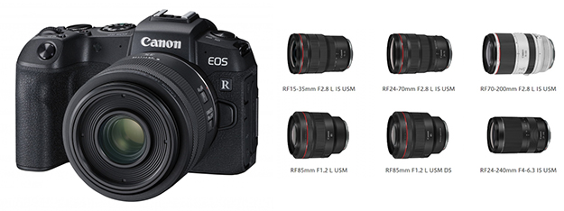 左からフルサイズミラーレスカメラ「EOS RP」、開発を表明した交換レンズ「RFレンズ」6機種