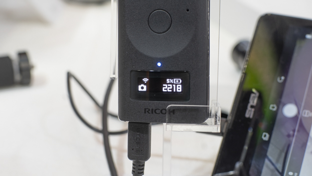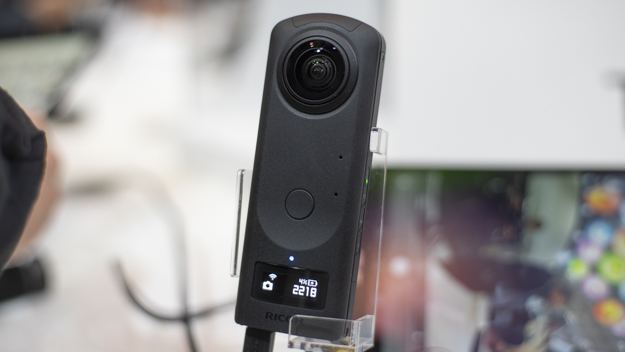 発表したばかりのTHETA Z1を展示。RICOH THETA Vから高さや幅などのサイズはほぼ変わっていないが、奥行きはやや厚くなっている。外見で変わったのはパネルの搭載だ。撮影可能枚数や露出設定などがモニターでわかるようになった。