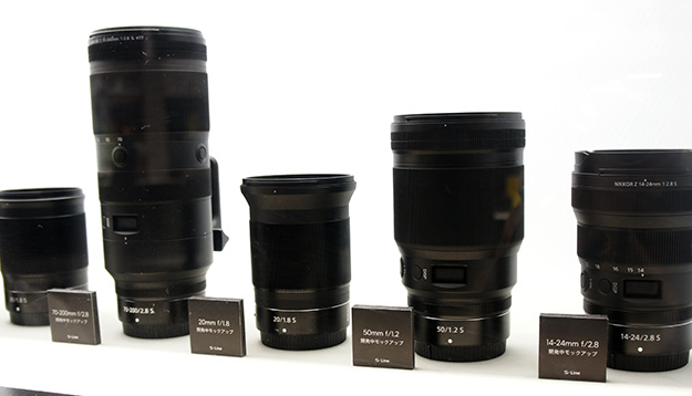 ニコンNIKKOR Zレンズシリーズ6機種を参考出展。20mm f/1.8、24mm f/1.8、85mm f/1.8、50mm f/1.2のほか、14-24mm f/2.8と70-200mm f/2.8のズームレンズの計6機種でいずれもS-Lineレンズ。すでに2018年8月に発表されたロードマップでは24mm f/1.8、85mm f/1.8、70-200mm f/2.8が2019年中、20mm f/1.8、50mm f/1.2、14-24mm f/2.8が2020年に発売予定となっている