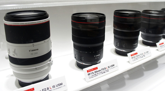 キヤノン開発中のRFレンズ計6機種出展。ズーム全域で開放F値2.8の大口径ズームレンズとしてRF15-35mm F2.8 L IS USM、RF24-70mm F2.8 L IS USM、RF70-200mm F2.8 L IS USMの3本のほか、開放F値1.2の大口径中望遠単焦点レンズRF85mm F1.2 L USM、RF85mm F1.2 L USM DS、高倍率ズームレンズRF24-240mm F4-6.3 IS USMの計6機種で、2019年中の発売を目指して開発中