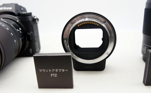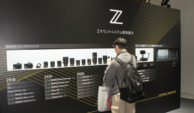 Zマウントシステム開発展示のコーナーではNIKKOR Zレンズのラインナップとして、2021年までのロードマップのリストと、既発表のものも含め12本のレンズやマウントアダプターFTZ、バッテリーパックなどをモックアップを交えて披露された