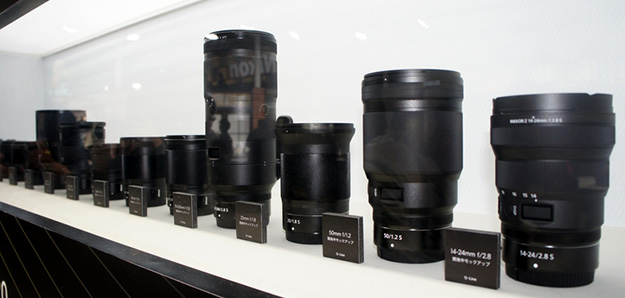 Zマウントシステム開発展示のコーナーで出展されていたZレンズのラインナップ