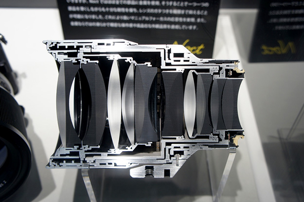 NIKKOR Z 58mm f/0.95 S Noctのカットモデル。レンズ構成はダブルガウスを基本とした非球面レンズを含む10群17枚構成で、反射防止コーティングには新開発のアルネオコートを採用している