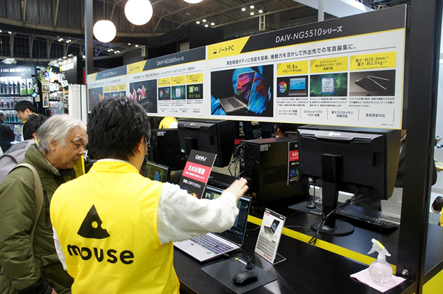マウスコンピュータは画像編集に最適なAdobe RGB比100%の広色域対応液晶を搭載するノートパソコンや、最新の第9世代インテルCore i9プロセッサー搭載デスクトップパソコンなど、多くの写真家、プロカメラマン、動画、3DCGを制作するクリエイターに選ばれているDAIVシリーズなどの最新機種を多数出展。