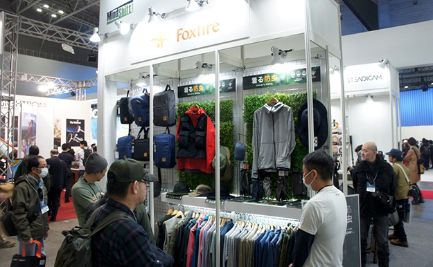 Foxfireは1982年に日本で誕生したアウトドア用品ブランドで、防水素材とメッシュ生地のコンビネーションによるフォトグラファーベスト、フォトレックマルチレイヤーベストなどがある。不快な虫が逃げていく防虫素材SCORONを採用したジャケットなどを出展。SCORONはアース製薬が開発した持続性の高い非揮散タイプの防虫剤を、帝人グループのナノレベルの接着技術により、生地そのものに頑強に固着させたもの