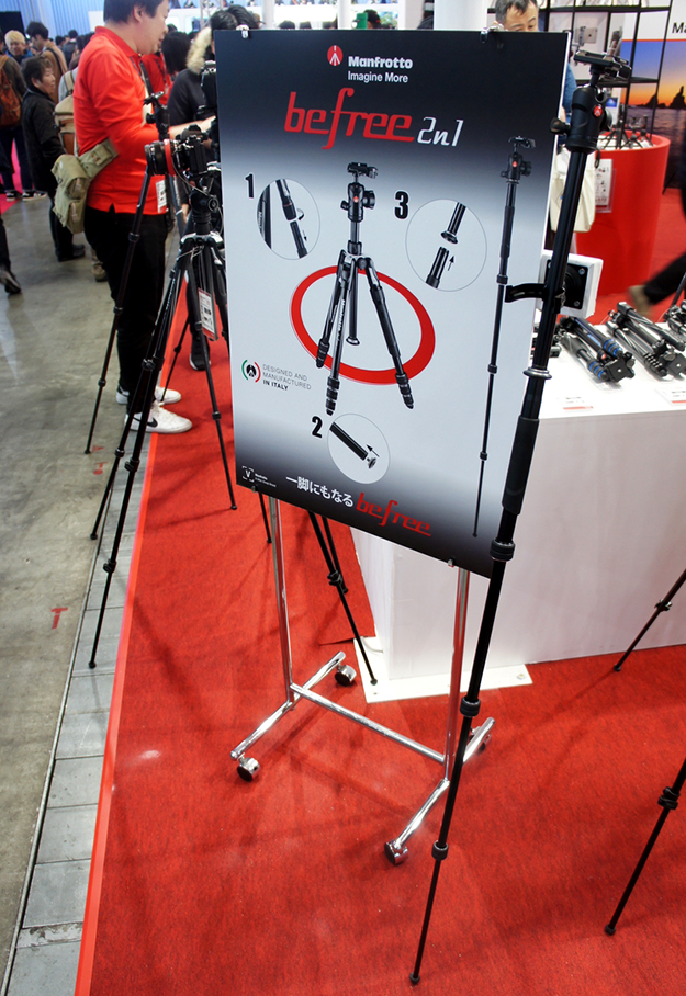 新製品としてはbefreeシリーズの三脚にソニーαカメラ専用カーボン三脚befree GTと三脚と一脚可変式モデルbefree 2n1がラインナップに加わった。また、Gitzoのミニトラベラー三脚やbefree Liveの雲台を採用したJOBYゴリラポット5Kキットなども新製品として出展されていた。