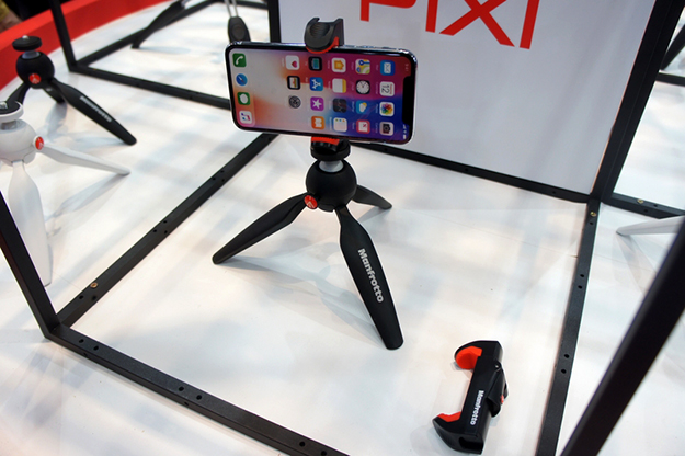 テーブルトップ三脚PIXI。プッシュボタンロック機構により簡単にセットアップできるほか、アダプターオプションによりスマホなども装着可能