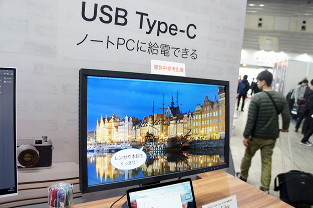 USB Type-CによりノートPCに給電できる開発中の製品を参考出展。USB-PD(USB Power Delivery)による60W給電に対応したColorEdgeブランドの27型ディスプレイで表示性能はCG2730およびCS2730相当となっている