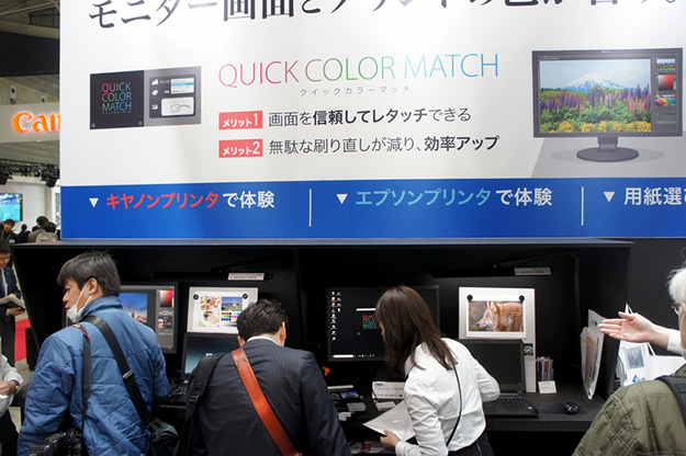 すでに恒例となっているモニターと写真プリントが簡単に色合わせできるソフトウェアQuick Color Matchの体験コーナーでは昨年に引き続き来場者がお気に入りの写真データをUSBもしくはメモリーカードで持ち込みQuick Color Match色合わせを体験し、その場でエプソンおよびキヤノンの高品位プリンターで出力し、完成プリントを持ち帰りできるコナーが人気となっていた。