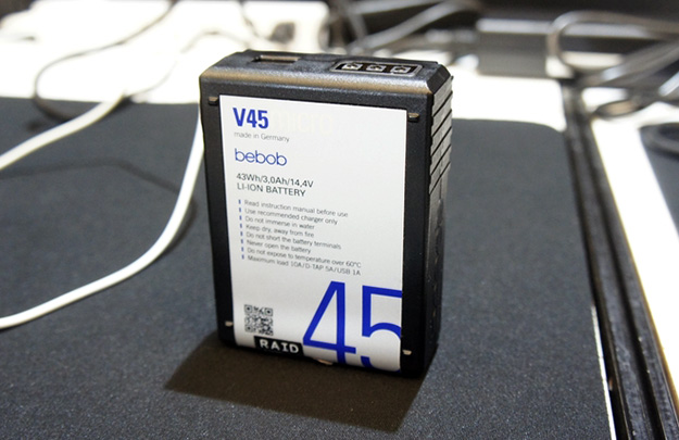 独bebob社のVMICROシリーズVマウントバッテリーV45MICRO。この他にも容量の大きなV98MICRO、V150MICROがあり、43W、98W、150Wの3種類がラインナップされている。バッテリーにはLED表示の残量計やツイストDタップ出力および5VUSB出力機能、フラッシュライト機能を搭載している