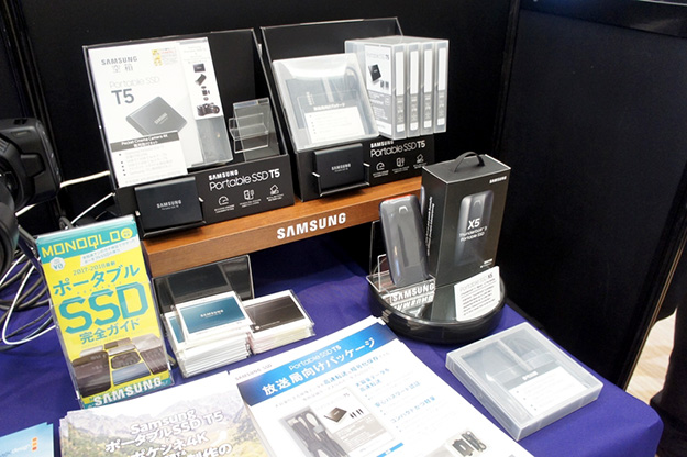 SamsungのポータブルSSD T5とX5を展示。T5はV-NANDフラッシュメモリーとUSB 3.1 Gen2インターフェースを搭載しており、最大540MB/sの転送速度を実現。専用ソフトによりデータの暗号化も可能。X5はThunderbolt 3を搭載しており、読み出し2,800MB/秒、書き込み2,300MB/秒の転送速度となっている。X5はオプションでAES 256ビットの暗号化によるパスワード保護に対応