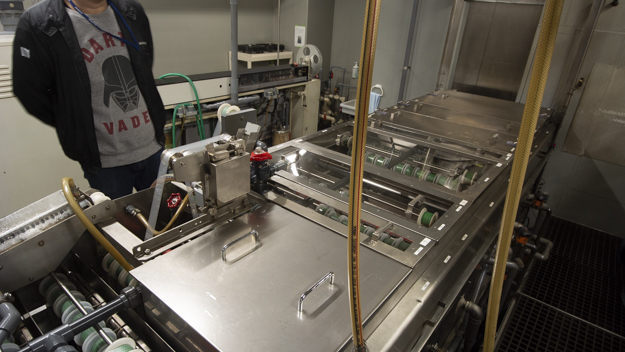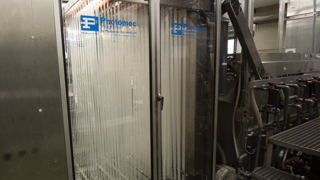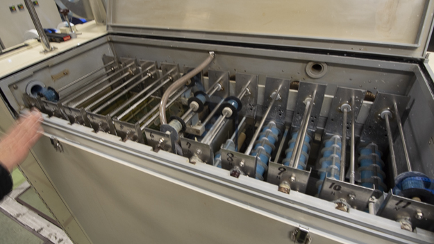 16mm/35兼用カラーポジ現像機はPhotomec社製で、基本はプリント用だ。ネガと違うところは、処理液がポジ用になっている。また、プリントにはサウンドトラックがあり、サウンド現像の工程が増えるために処理が長くなる。