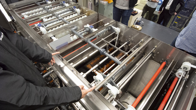 密着プリンターは五反田から大阪に移転してきたものだが、オペレーションやメンテナンスが特殊な機材だ。そこで、五反田の担当スタッフが機材と共に大阪に転勤し、活躍中だという。
