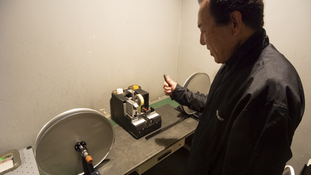 IMAGICA Lab.のカラーネガ現像機は明室タイプ。撮影現場から撮影済みのフィルムロールが持ち込まれると、暗室でマガジンへ移し替えの作業を行う。この作業は感光を防ぐために、完全に真っ暗な暗室で行われる。暗室の解説は、IMAGICA Lab.のすべてのフィルム現場経験があるベテランの技能者、関口譲氏。