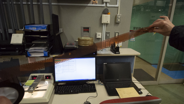 アーカイブの部門では、外部から持ち込まれた古い旧作やアーカイブのネガの整理が行われている。キズや不具合の確認やゴミを除去して、焼付け作業ができる状態に整理する。次のプリントの工程で機械にかけるので、機械にかかるようにフィルムの補修もここで行う。