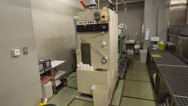 現像所の中でも一番大事なのがフィルム現像機だ。フィルムの現像が上がらない限りは、プリントもできないし、スキャンもできない。現像機は、現像所の命と言ってもいいだろう。IMAGICA Lab.のカラーネガ現像機は、イギリスのPhotomec社の16mmと35mmの兼用機を導入している。Photomec社は世界的にも信頼があるメーカーで、コダックも推奨しているメーカーだ。中身は、IMAGICA Lab.で日本人が好むようにカスタマイズしているという。