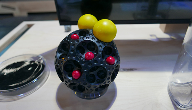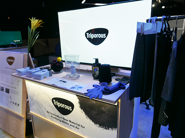 展示の中でも異色だったのがソニーが開発した素材。植物由来多孔質炭素材料「Triporous™(トリポーラス™)」だ。籾殻の形状特性を生かした余剰バイオマス(再生可能な生物由来の有機性資源)を原料とした独特の微細構造を有する多孔質炭素材料。洗剤や素材に練り込むなどすでにライセンスが始まっているという。