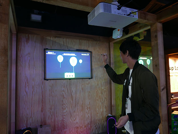 ソニーPCLとアカツキライブエンターテインメントの共同展示の「Flash Darts」は、ダーツゲーム型のインタラクティブコンテンツです。ハプティクス(触覚)機能で全身で楽しめる臨場感と没入感のあるダーツが楽しめる。