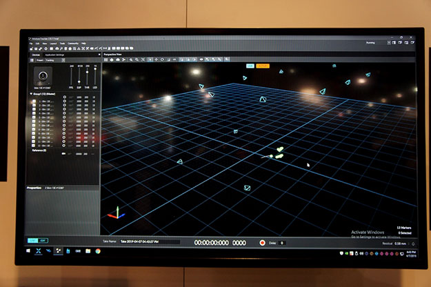 ブースではBLACK TRAXリアルタイムトラッキングシステムと組み合わせたシステムが特徴的で、BLACK TRAXの小型赤外線送信を付けた人物に切り出しの枠が追従するようになっており、AK-SHB800GJが撮影している範囲で4つのHD画像を被写体の動きに追従させることができる。