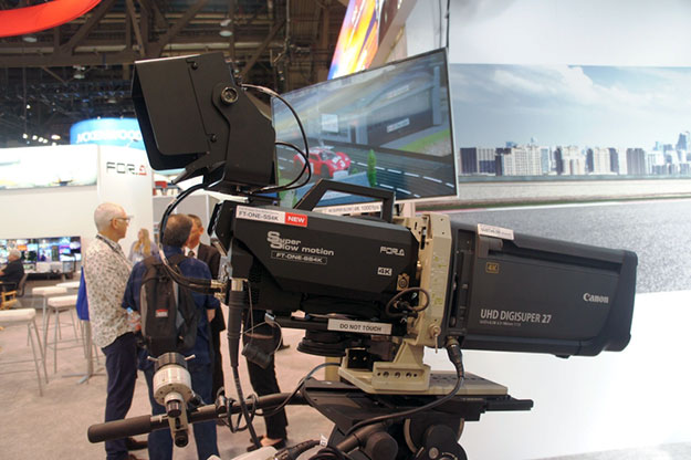 朋栄はB4マウントを採用したフル4K高速度カメラFT-ONE-SS4Kを出展。高速度カメラはスポーツ中継などで利用されることが多く、そうした運用では高倍率ズームレンズが定番といえ、レンズのラインナップが豊富かつ周辺機器も充実したB4マウントに対応したという。もちろんセンサーも2/3インチのものを搭載しているが、センサーサイズが従来機より小さくなってしまうと感度の点で不利になるが、従来機と遜色のない感度を維持している。4Kで1000コマ/秒までの高速度撮影が可能なほか、EVS製ビデオサーバーを使用して4Kで3倍速またはHDで6倍速の長時間収録に対応。