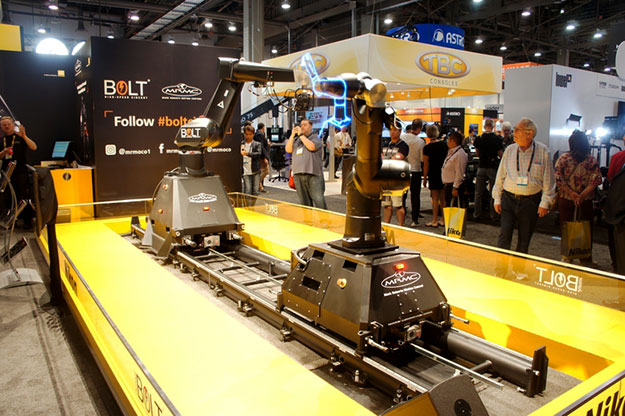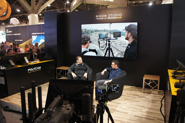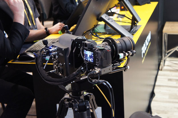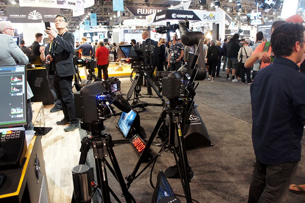 昨年あたりからニコンはロボットを使った撮影システムを出展。ブースだけでなく会場入り口でもロボットに搭載したカメラで参加者を撮影するパフォーマンスを行うなど、結構派手な演出をしている。ブースでも同様のモーショントラックングによる撮影システムを紹介しているが、これらは予めプログラムされたものとなっている