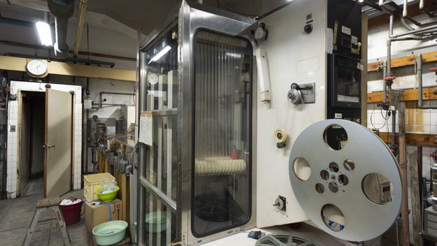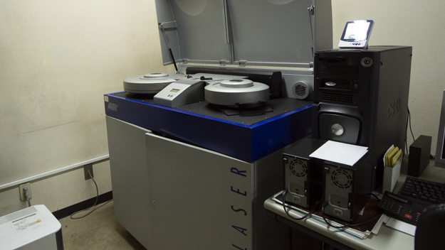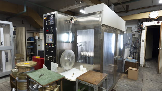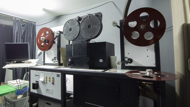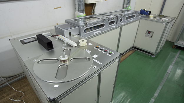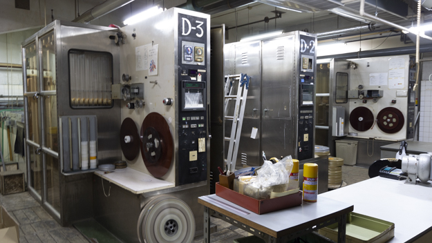 現像機フロアで目を引くのが、映写用プリント用カラーポジ現像機だ。16mm、35mmが各1台稼働している。フィルムで映画のプリントが焼かれた全盛期は、24時間体制で4台のカラーポジ現像機がフル稼働していたという。