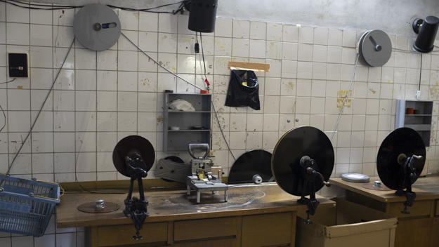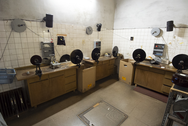 検尺を行う部屋には数多くのリワインダーが並んでおり、ここで作品ごとに紙テープやタイミングデータの修正が行われる。机のライトテーブルは、すべて自社によるカスタマイズだという。