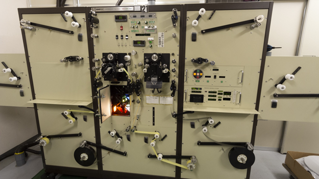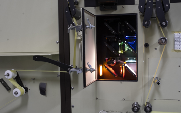 ネガをポジに焼き付ける密着プリンターは、米国BHP製が導入されている。非常に高速で、最高速度は600フィート/分で動作が可能だが、約480フィート/分に抑えて使用しているとのこと。映画館に収める大量焼き増しに使われていた際には、6台が24時間フル稼働していたという。特に優れているところは往復で焼付けができる双方向フィルム搬送システムで、スタートからエンドにかけてポジへの焼付けが終わると、今度はエンドからスタートにかけてポジに焼付けが可能。