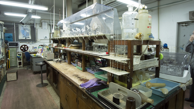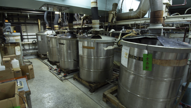 分析室では、主に現像機で必要な液の調合や分析が行われている。また、排水処理からメンテナンスまで手がけている。具体的には、現像機に液が入るまでのポンプや配管、現像機からオーバーフローした液の回収装置などのメンテナンスまでもが担当とのことだ。