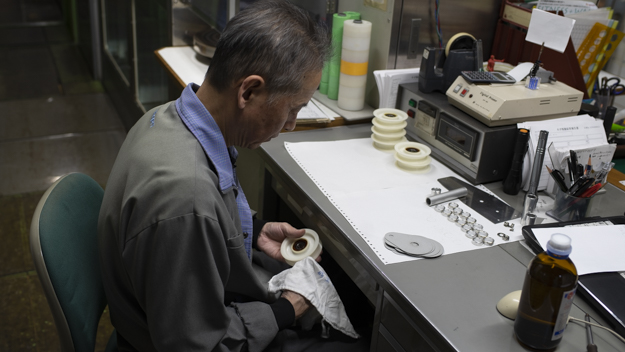 チェックは、フィルムの端を触って指先の感触で切れ目を確認していく。また、カウンターにかけ、検尺を行う。