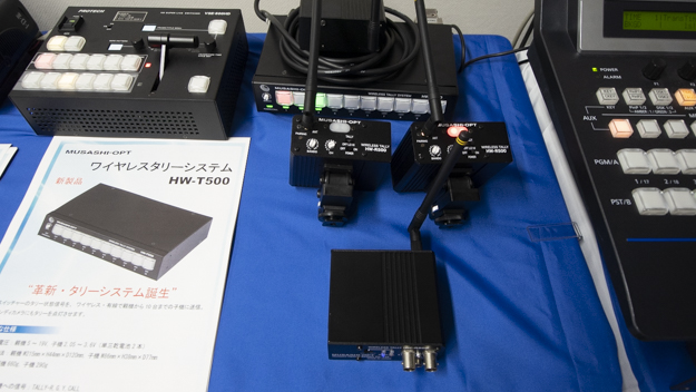 武蔵オプティカルのコーナーで特に目を引いたのはワイヤレスタリーシステムの「HW-T500」だ。Wi-Fiの周波数を使用しているとバッティングの可能性があるが、HW-T500は920MHzのサブギガ帯の周波数帯を採用し、誤動作の恐れを回避している。さらに1台に子機10台つながり、かつ、ワイヤレスで全長見通し6kmをまで飛ばせる仕様を実現している。