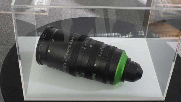 開発中の望遠ズームレンズ「FUJINON Premista80-250mmT2.9-T3.5」はガラスケースに収められて展示されていた