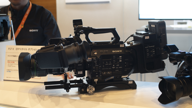 まずはカムコーダーゾーンの展示から紹介しよう。カムコーダーゾーンでの展示で目に止まったのは、NABで発表されたFS7とFS7 IIで快適なショルダー運用を実現するビルドキットだ。