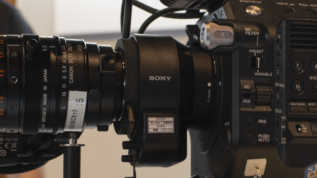 LA-EB1は、B4のイメージサークルをおおよそスーパー16ぐらいまで拡大光学系で大きくする仕組みを搭載している。なぜスーパー35まで大きくしないのかと思われるが、ブースにいたスタッフの方いわく「B4の小さいイメージサークルをスーパー35まで拡大すると2絞り半ぐらい暗くなってしまう」とのこと。拡大率を抑えることで0.6ストップぐらいの感度低下に防いでいるという。