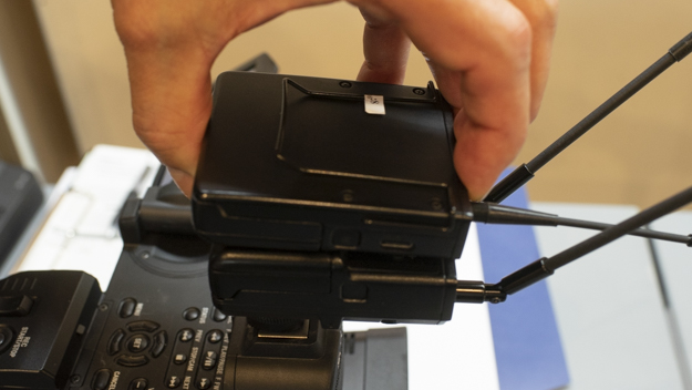 2014年に発売した送信機と受信機がセットのワイヤレスマイクロホンパッケージ「UWP-D11」の後継機となる「UWP-D21」を展示していた。後継機は「小さくなった」というのが第一印象だ。現行機と後継機の送信機のサイズを比較を比較してみたが、やっぱり一回り小型化されている。