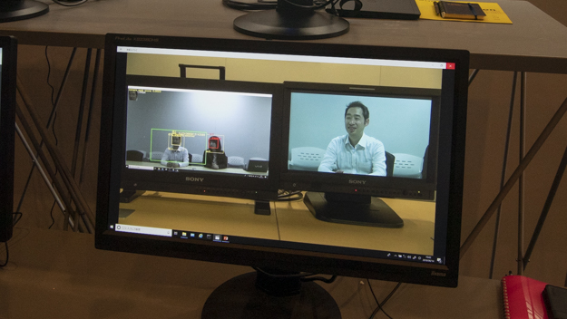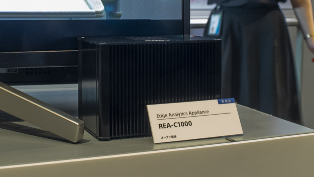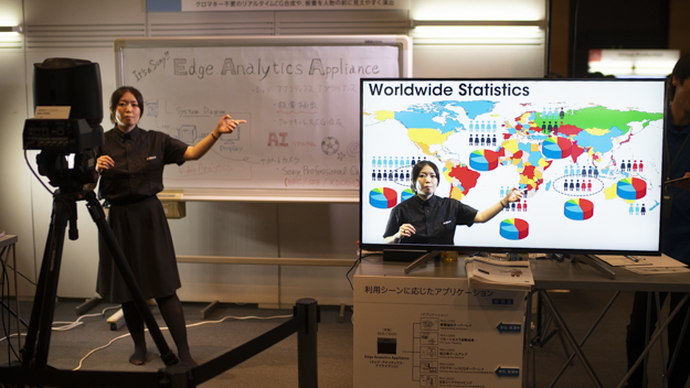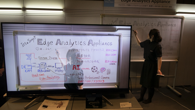 今年の内見会が例年と違うところは、映像系に関するAIを使った新規ソリューションの展示が充実しているところだ。その中でも展示会場でひときわ注目を浴びていたのが、映像制作支援ユニット「Edge Analytics Appliance」だ。ハードウェアを使って色々な機能の実現が可能で、映像コンテンツを生成できる商品になっている。その中から、「クロマキーレスCGオーバーレイ」と「板書抽出オーバーレイ」のデモが行われていた。